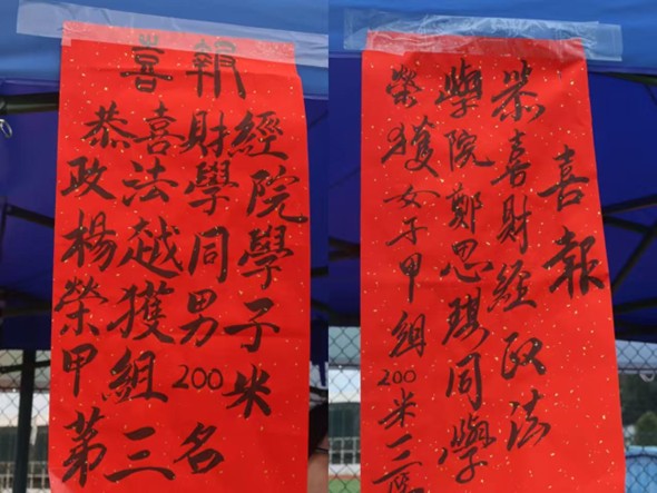 赛场上,运动健儿们在各个项目中奋勇争先。在男子甲组200米决赛中,杨越同学凭借强劲实力斩获季军,他如离弦之箭在跑道上疾驰,用速度与耐力展现了财经政法学子的拼搏底色;郑思琪同学则在女子甲组200米决赛中勇夺第三名,她的每一次摆臂、每一次蹬地都凝聚着汗水与坚持,用坚韧书写不服输的青春故事。