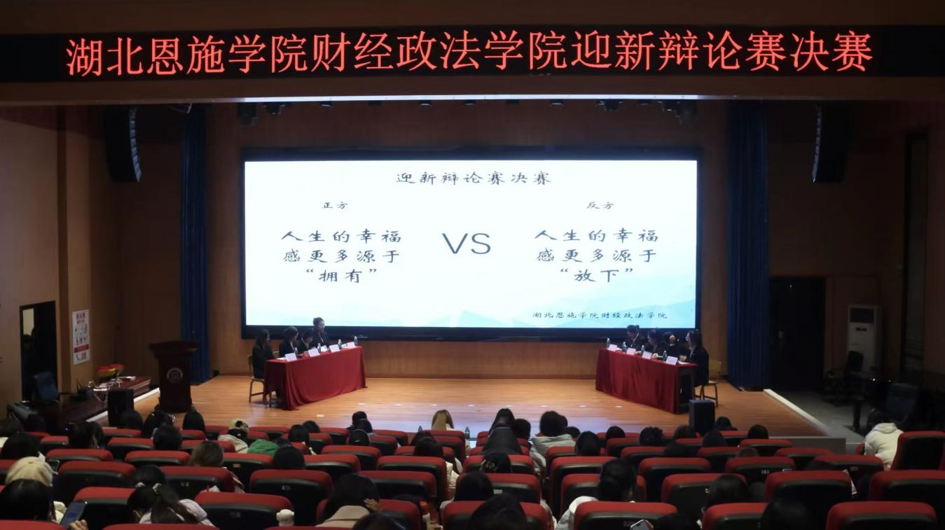 本网讯(通讯员 沈欣 肖玉滢/文 邵毓航/图)为深挖幸福的多元内涵、搭建青年思想交锋的平台,展现当代学子的逻辑思辨与人文素养,进一步营造校园学术交流的浓厚氛围,2025年11月17日晚18:00,财经政法学院2025级迎新辩论赛决赛于学术报告厅正式拉开帷幕。本次决赛围绕“人生的幸福感更多源于‘拥有’VS‘放下’”这一核心辩题展开,比赛全程设置七个环节,来自学院的两支辩论队聚焦议题、激烈角逐,现场思维碰撞不断,掌声此起彼伏。