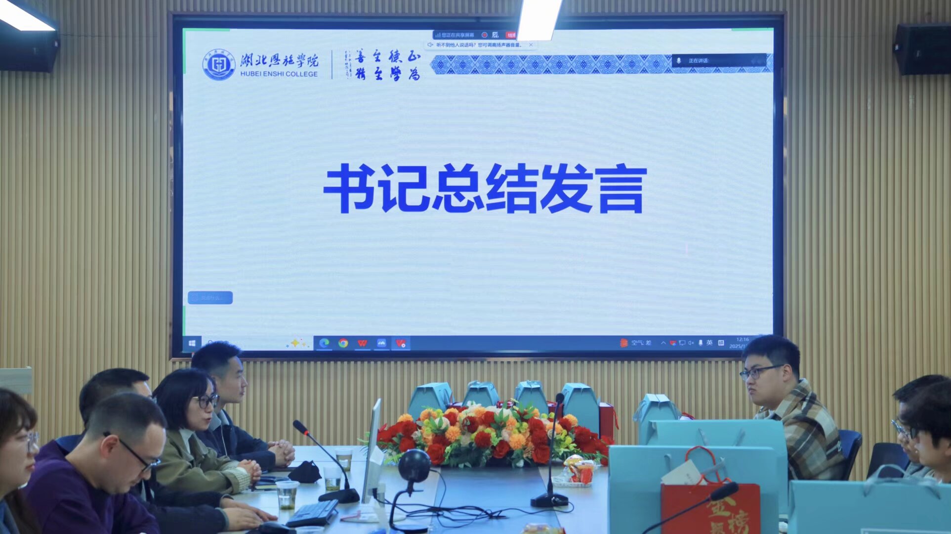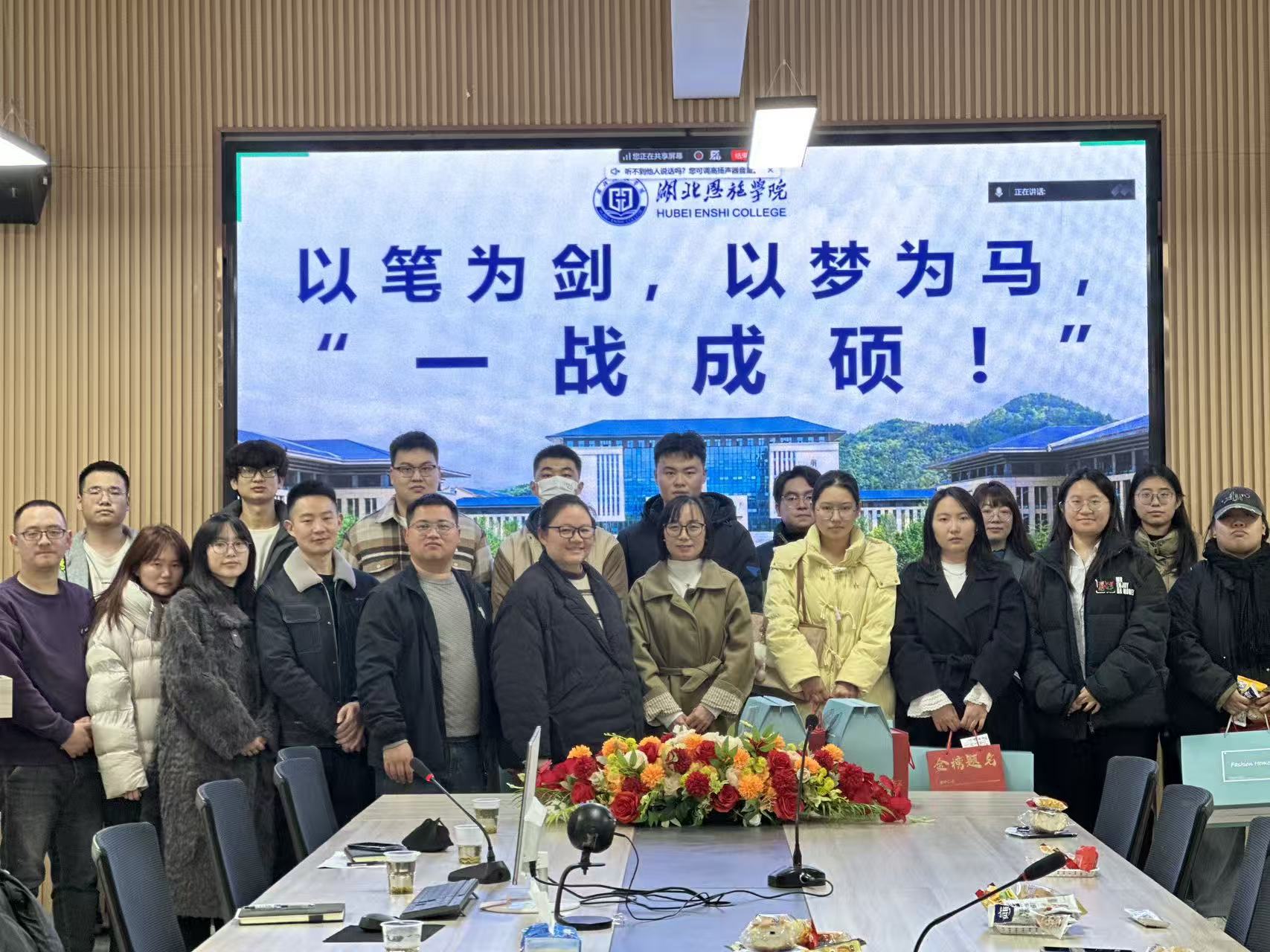活动现场暖意融融,会议桌摆放的鲜花与慰问物资相映成趣,大屏滚动的“以笔为剑,以梦为马,一战成硕”的标语,字字铿锵,直击学子心底。学子们到场后,老师们热情引导就座,瞬间拉近了彼此的距离。开场时辅导员便以“考研是为自己拼、千万别弃考”的朴实话语打气,瞬间点燃现场氛围,又仔细叮嘱“考场别空题,把学过的内容都写上”,用细节传递关切。