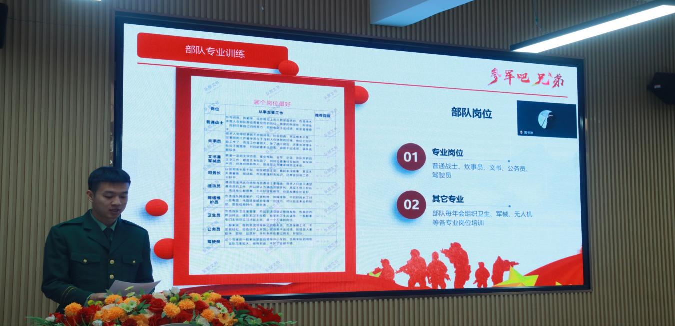 随后袁力生学长结合武警服役经历,分享了部队里的所见所感与成长收获,重点讲解参军的权益保障,细致解读部队日常作息与生活状态,打消了同学们对部队生活的顾虑,缓解了大家的入伍焦虑与心理压力。